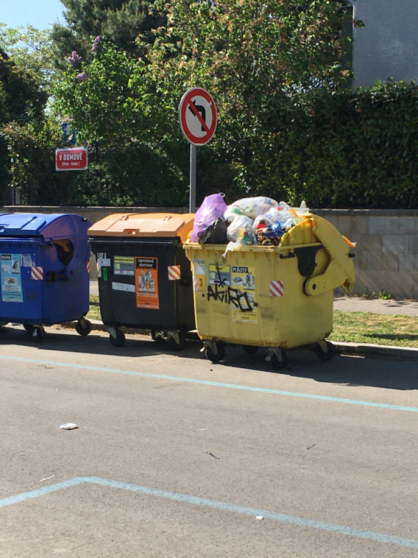 Preplneny a otevreny kontejner a rozlitane plasty po ulici - fouka, roh uliv Sikma a V Domove
