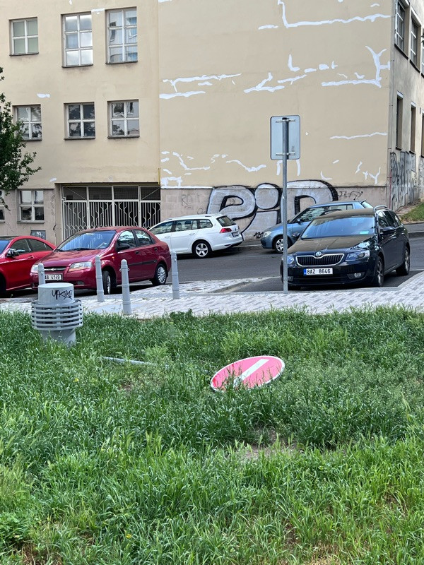 Moc děkuji. V mezidobí někdo navíc odcizil i samotnou dopravní značku, takže na trávníku je jen sloupek.