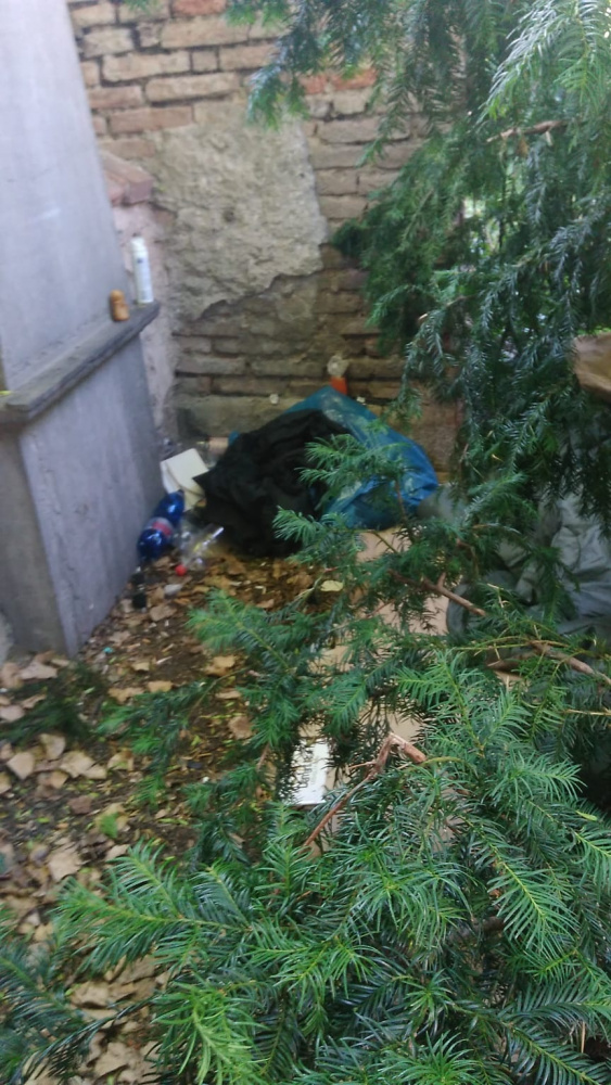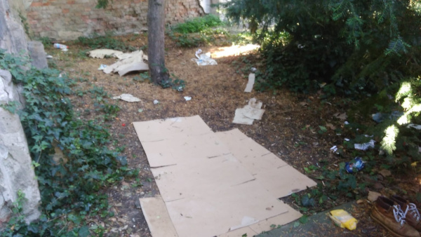 bordel po bezdomovcich v kerich u Rocha, všude kolům zdí