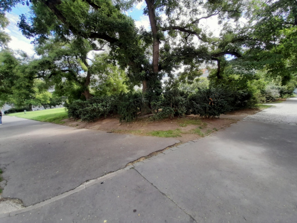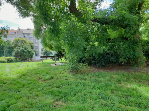 krabice a nepořádek a lidské exkrementy v křoví na Žižkově náměstí