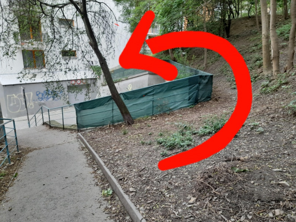 Vrch sv. Kříže - nepořádek dole v rohu nad vchodem do bunkru a garáží v Českobratrske ulici