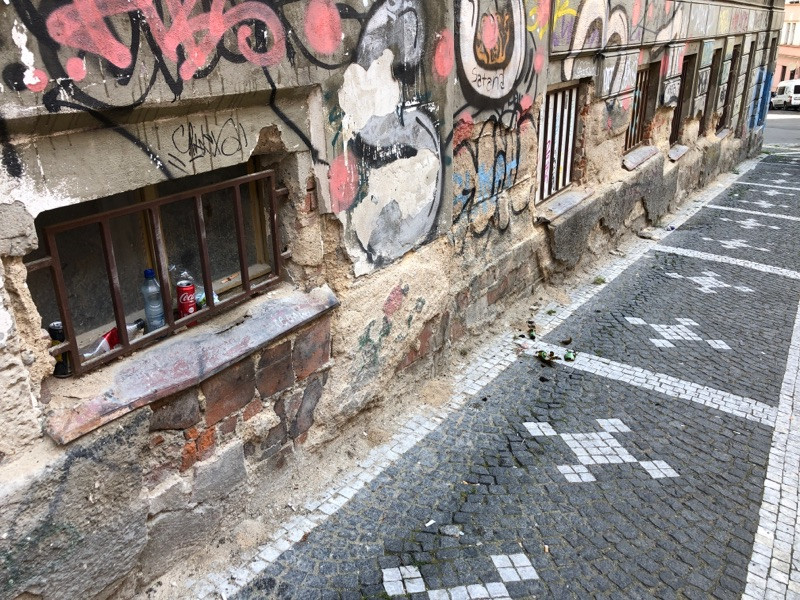 Rozbité sklo na chodniku a nepořádek
