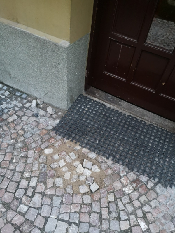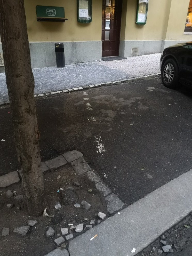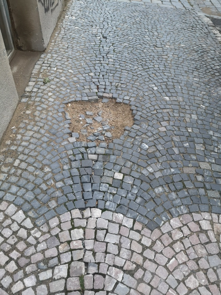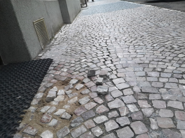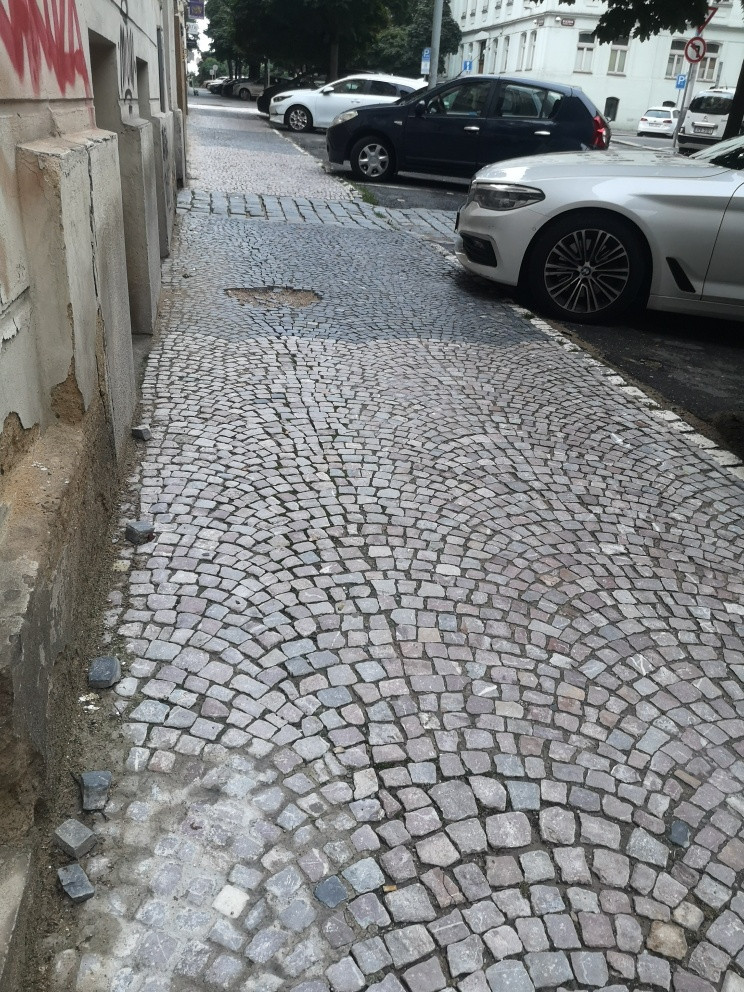 Vydrolene a poházene kostky chodniki v Ripske. Spatne polozeny chodnik. Diry a Vydrolene kostky mezi zaparkoványmi auty ohrozuji vozidla. Diry a pohazene kostky pred prostorem billiard clubu a army shopu. Takto polozen chodník z kostek po zavadeni upc kabelaze.