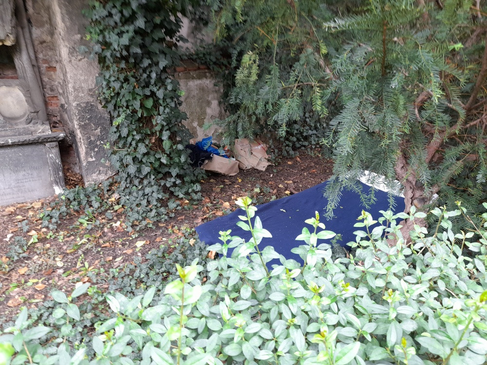 bordel po bezdomovcich na hrobech u zdi u sv. Rocha