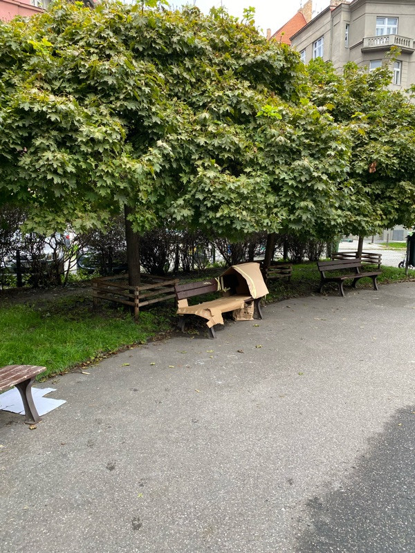 Polepená lavička kartóny. Asi provizorní přístrešek