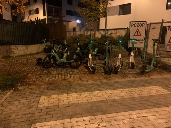 Odstavene elektrokolobezky mimo vyhrazene misto. Brani prechazeni.