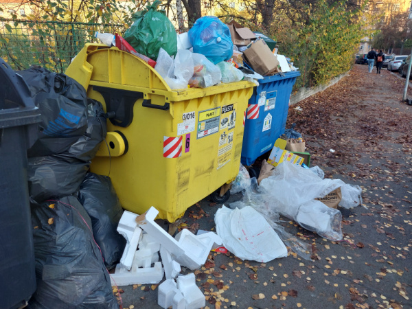 Nedostatečná frekvence svozu tříděného odpadu, sběrné nádoby jsou neustále plné, odpadky se válí po chodníku.
