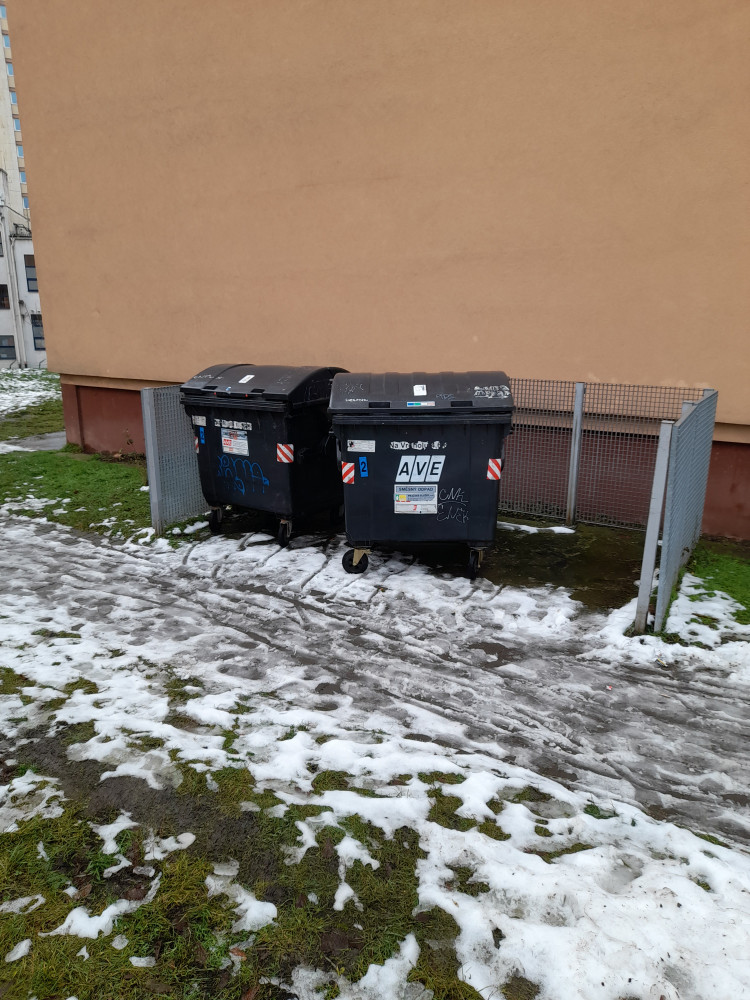 Nepořádek u popelnic u domu Na Vrcholu 8