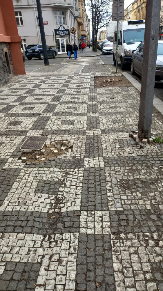 Rozebraná mozaika v chodníku.