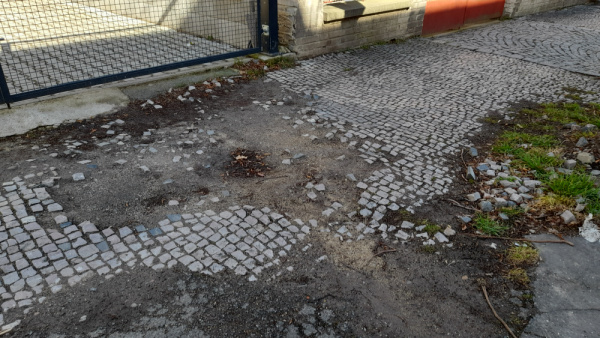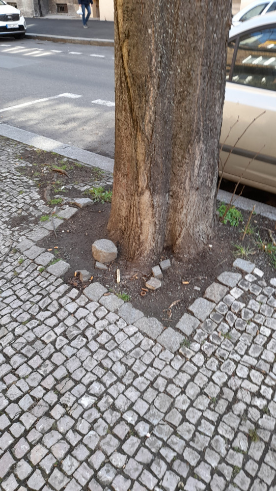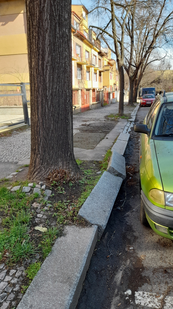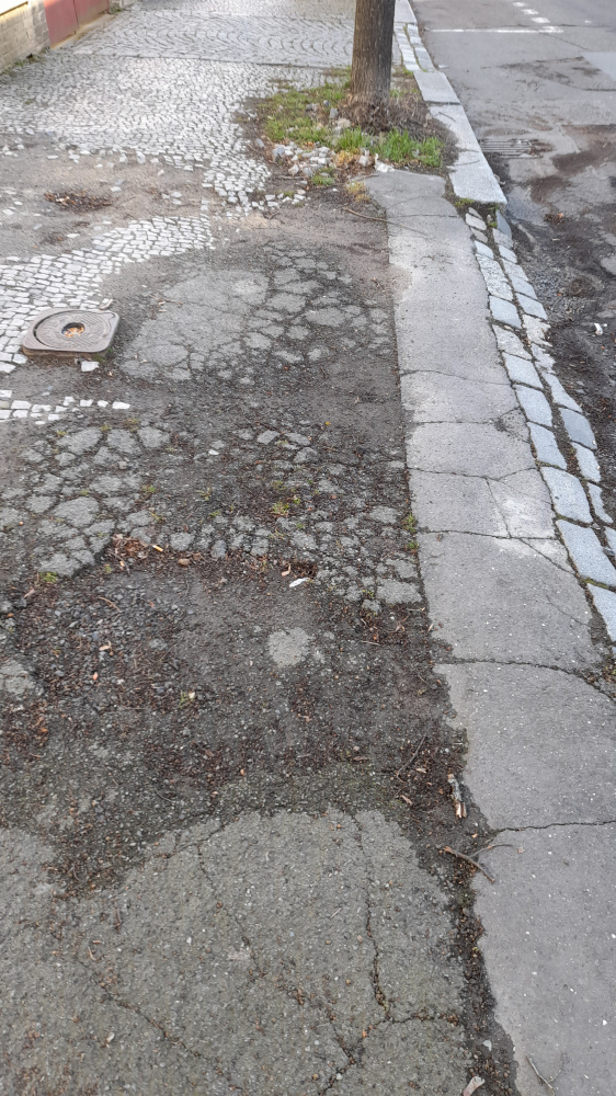 rozpadající se dlažba (kostky), vyvrácené obrubníky (strom)obrubník)