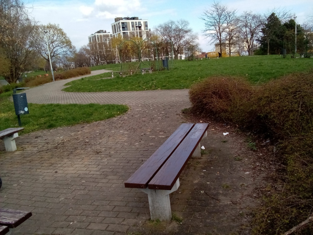 nepořádek u laviček na Židovských pecích, lavičky jsou na kopečku u dopravního hřiště