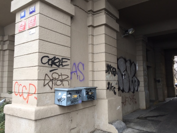 u vchodu do dvora ze Slezské ulici stěny jsou pokryty s graffiti. Některé z nich jsou vulgární. Jsou velmi ošklivé a je to tak nepříjemné jim vidět pokaždé, když procházete..Mohl byste prosím odstraňit je a vratit stěny do normálu pro obyvatele tady. Moc Vam predem dekujem.