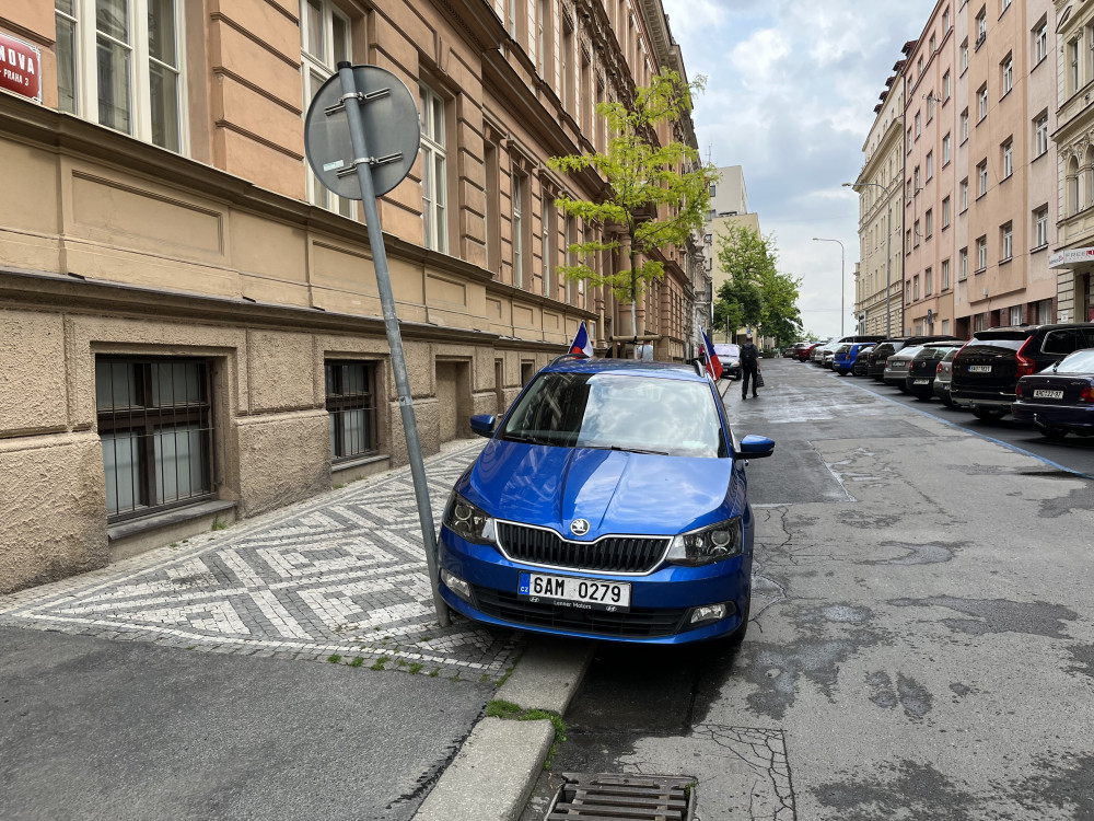 Pán při parkování na chodníku naboural do značky.