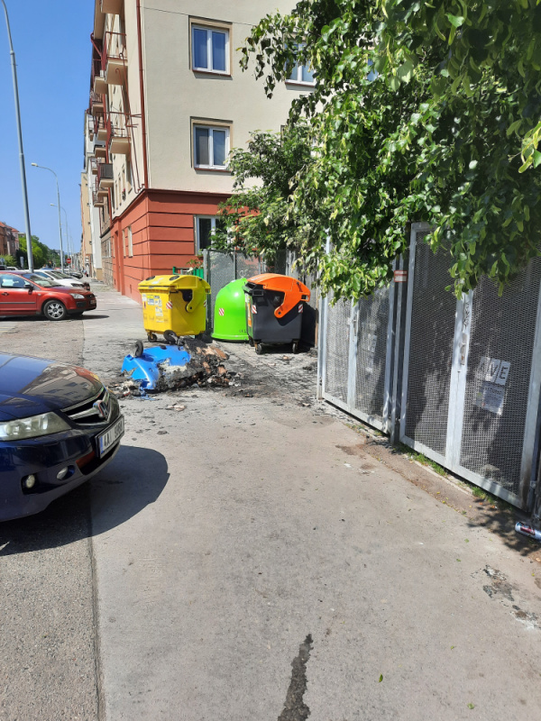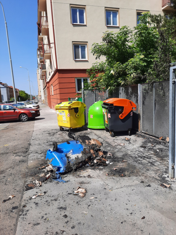 Shořelý kontejner po včerejším požáru leží po zásahu hasičů uprostřed chodníku a zbytky odpadu popela létají po okolí ulicí.