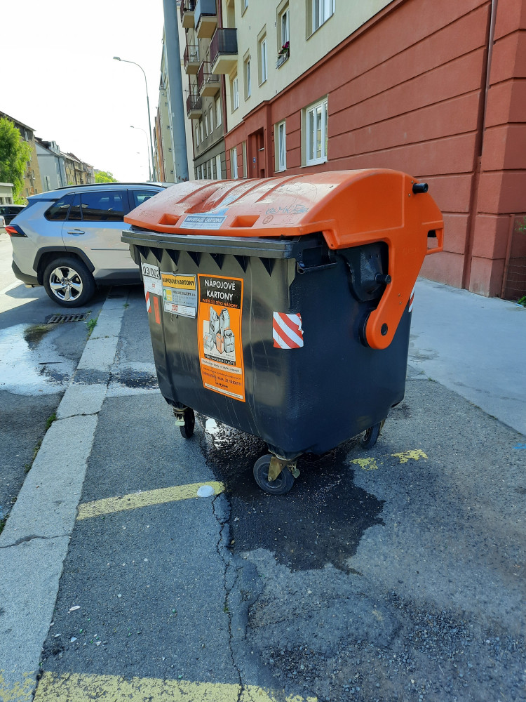 Další shořelý kontejner. Nyní uprostřed chodníku. Namísto shořelého kontejneru na papír z minulého týdne se papír hromadí na chodníku. Kde je možné zajistit nový kontejner na papír?