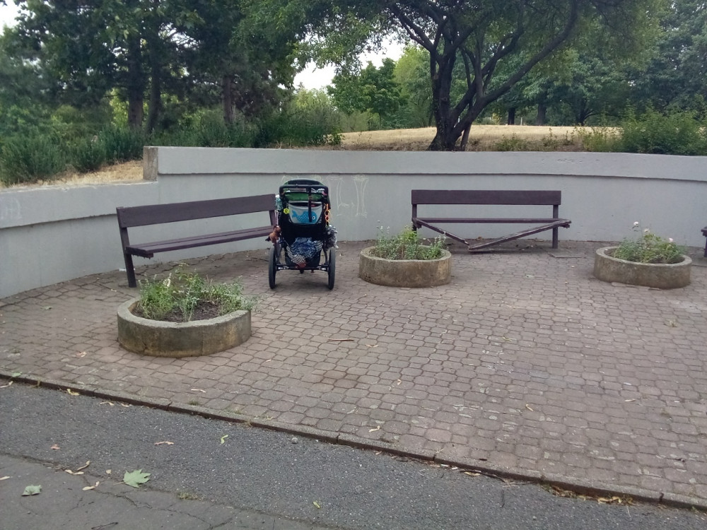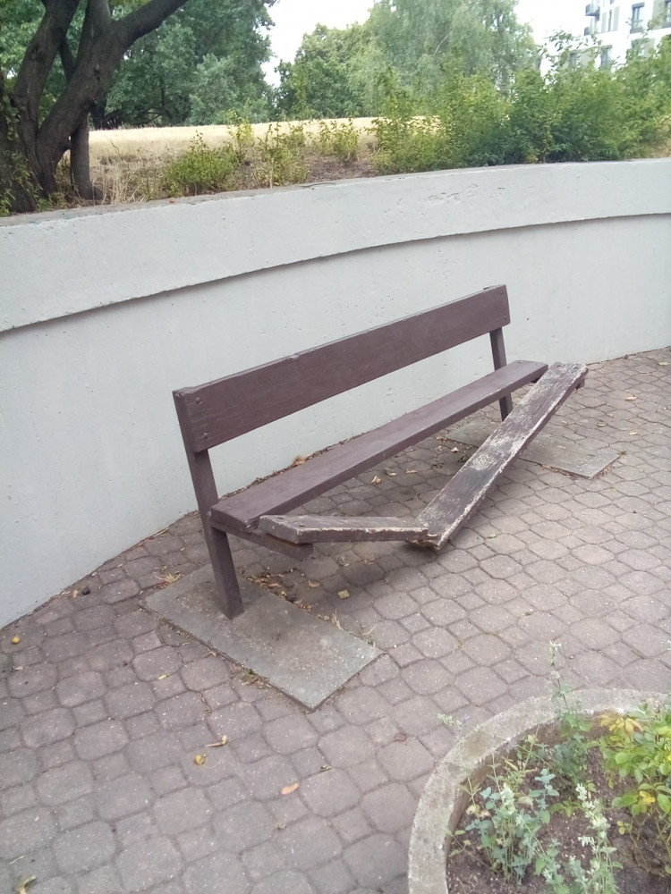 rozbitá lavička v parku židovské pece, na místě, kde stávala pergola