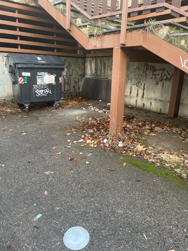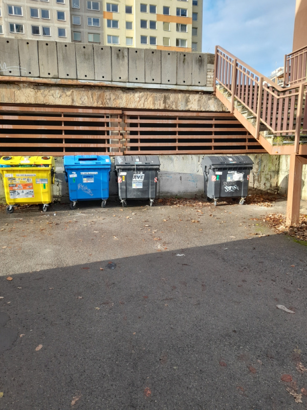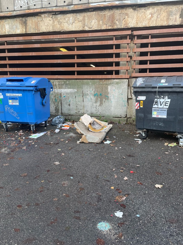neporadek kolem popelnic. pozor je tam i hovno neslapnite. Diky