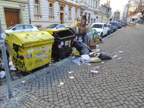 Nepořádek kolem tříděných nádob.