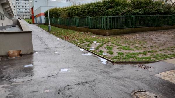 poházené papíry ve vnitrobloku Roháčova na chodníku k mateřské škole