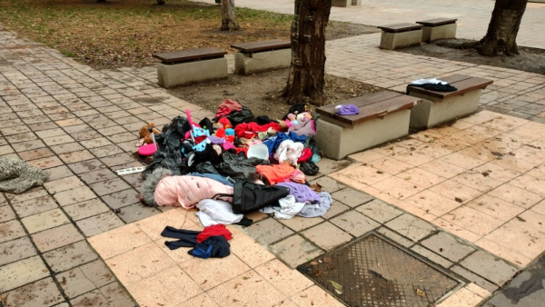 pohozené šatstvo na chodníku ve vnitrobloku Blahoslavova