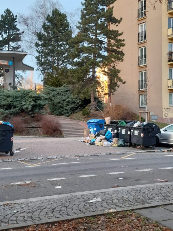 Hrozný nepořádek kolem kontejnerů u koleje VŠE, smetí rozházené po celé ulici v okolí.
