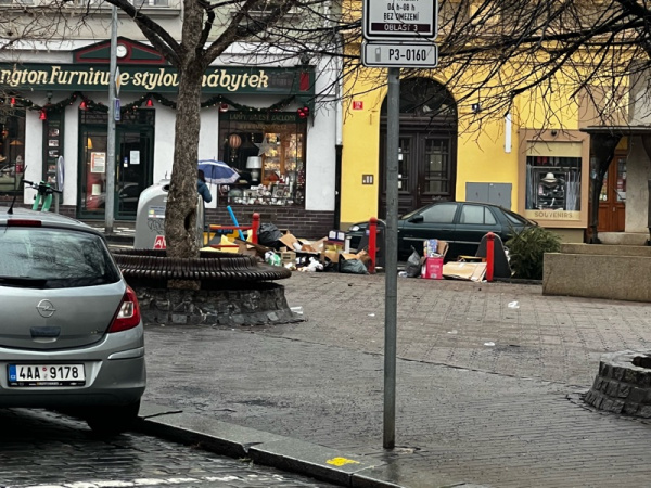 Poházené odpadky okolo kontejnerů na Prokopově náměstí