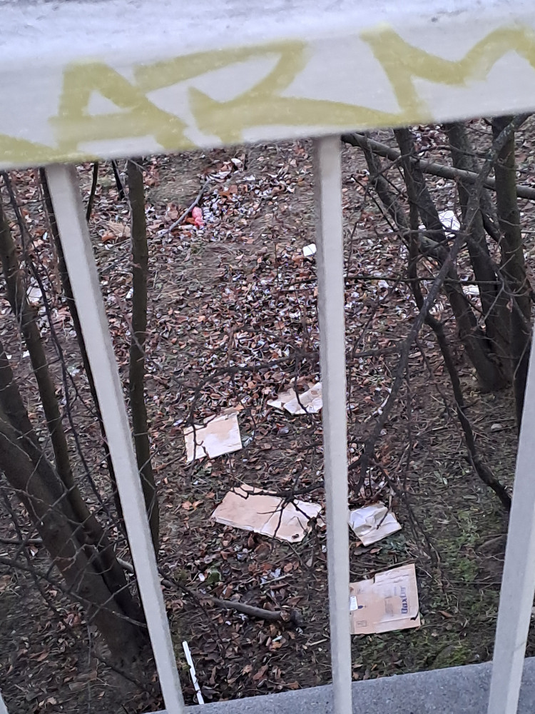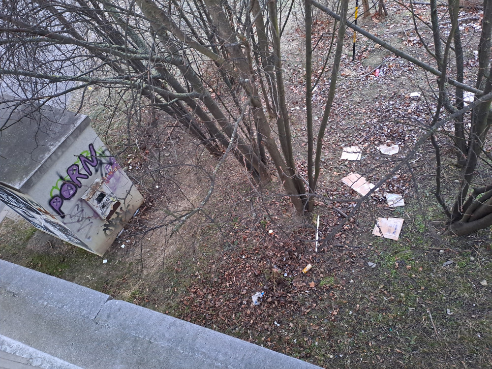 Nepořádek na úpatí mostu pro pěší, ve svahu za WC řidičů MHD