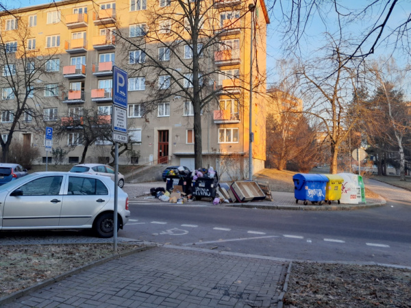 Prosím o úklid. Přeplněné kontejnery a kolem nich nábytek a paleta. Děkuji.