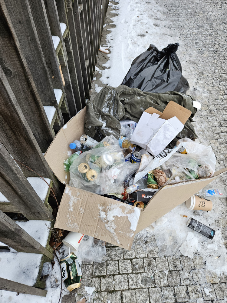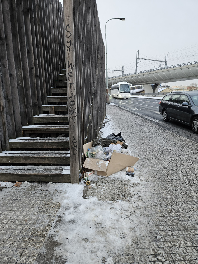 Nepořádek u nástupu na Highline Žižkov. Krabice s odpadem.