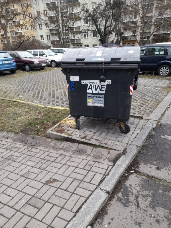 Nepořádek u kontejneru Hartigova 1191/109, příjezd z ul. Nad Ohradou, ten je I na protější straně ulice u tújí.