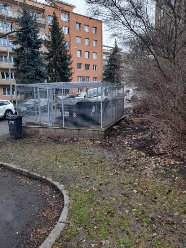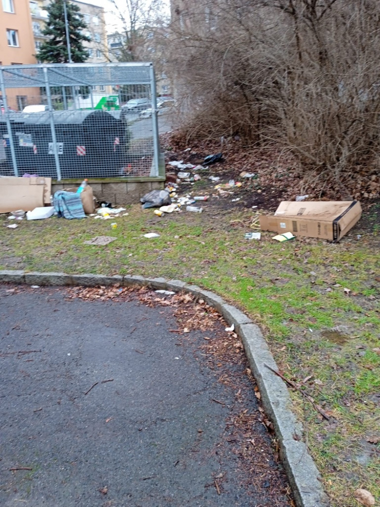 nepořádek okolo kleci se směsnym odpadem na Chmelnici v ulici Luční