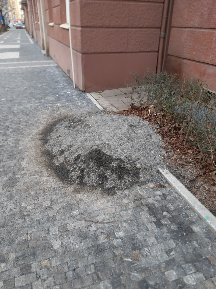 Po opravě chodníku zbyla po dělnících hromada štěrku, která tu leží již několik měšíců. Prosím o úklid.