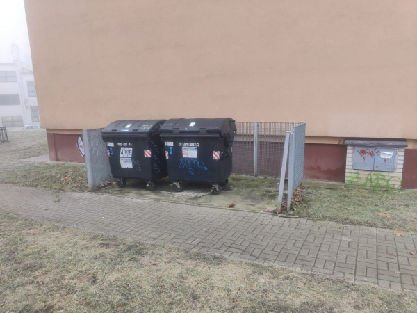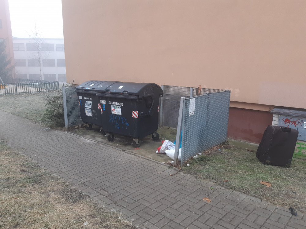 Nepořádek u popelnic u domu Na Vrcholu 8