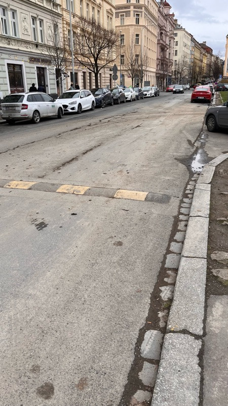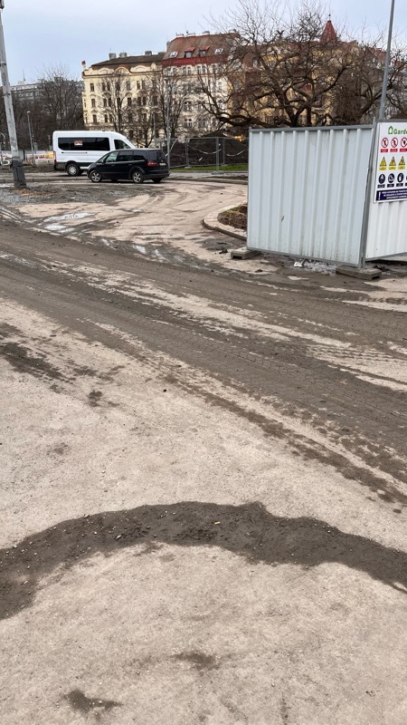 Znečištění komunikací v souvislosti s rekonstrukcí nám. J. z Poděbrad. Nákladní vozy rozvážejí bahno po okolí. Za sucha obrovská prašnost. Vozy nejsou u výjezdu ze stavby omývány, jak je běžné u takových staveb.