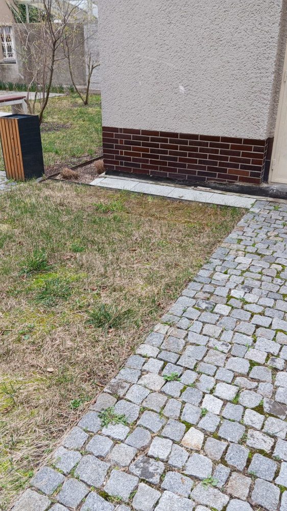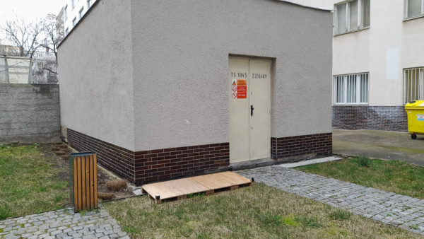 poliklinika Vinohradska- vnitroblok - cihly před vchodem a paleta na trávníku