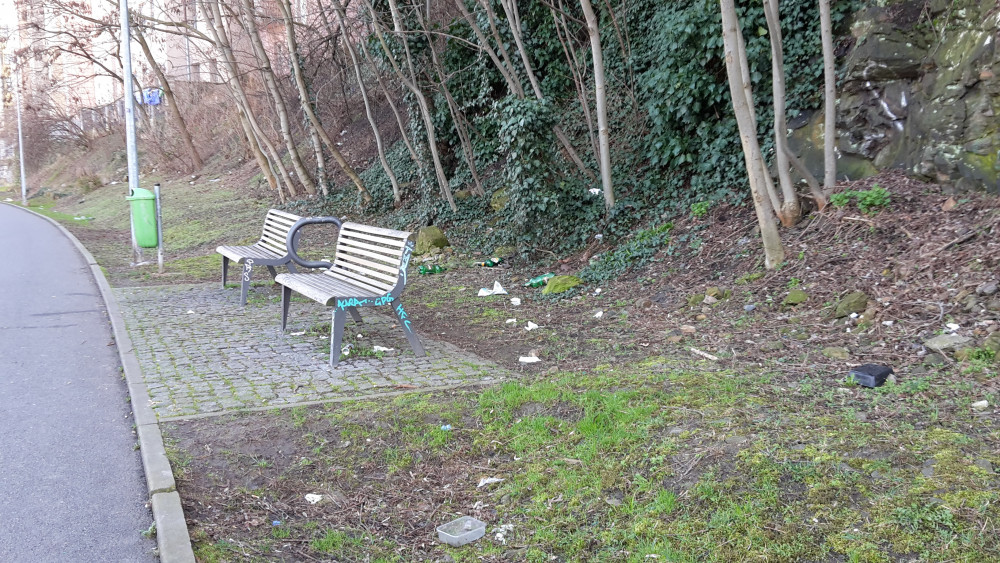 Prosím o zajištění úklidu, okolí opět připomíná skládku (úsek po můstek)