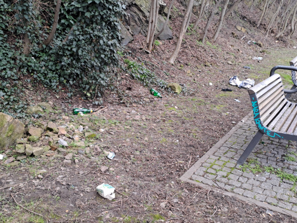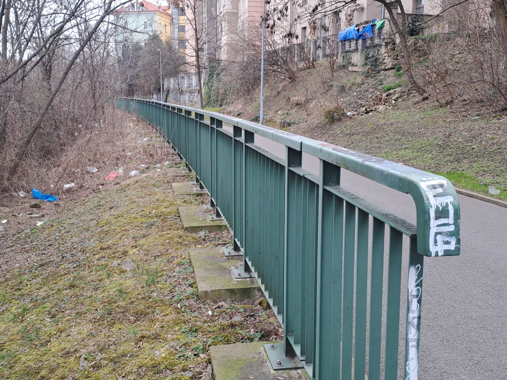 Nepořádek kolem cyklostezky po zrušené žel. trati od ul. Seifertova po most přes ul. Husitská.