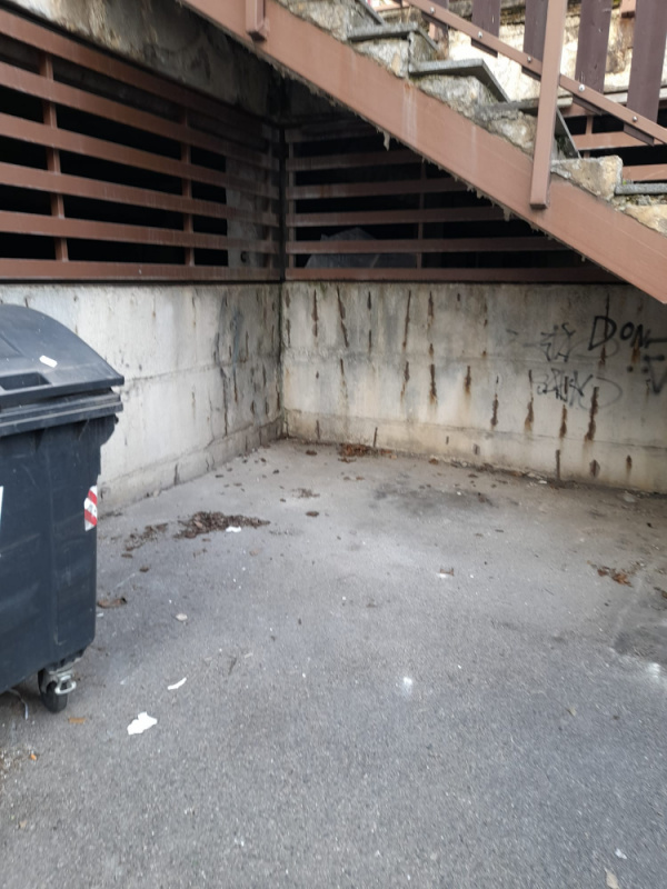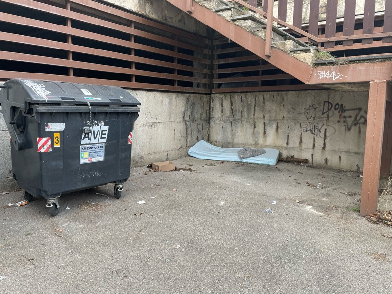 neporadek kolem popelnic a odlozeny matrac