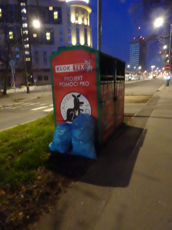 V ulici Izraelska jsou vyhozeny 2 pytle s asi oblecenim vedle kontejneru na textil.