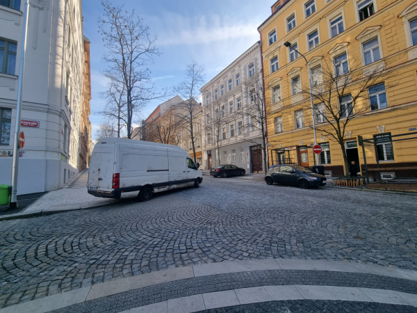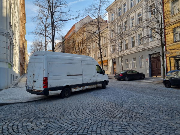 Již po několik dnů stojí na chodníku v křižovatce tato nepojízdná dodávka . Blokuje chodník a ohrožuje provoz, protože přes ní nemůžou vozidla jedoucí dolů vidět auto, kterému mají dát přednost zprava, druhé auto je také nemůže vidět.