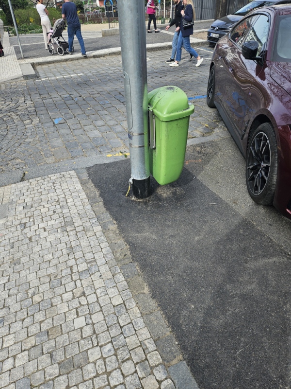 Chybně otočený koš. Má být o 180 ° jinak. Teď překáží autům a lidi k němu mají horší dostupnost