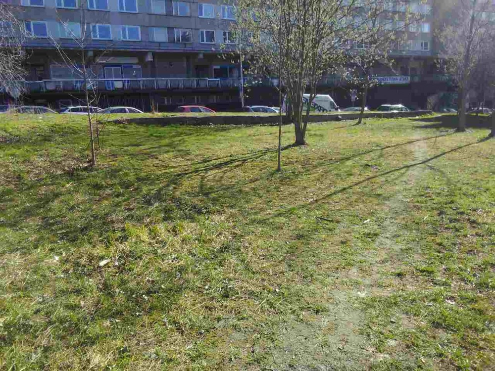 Zelena louka nad Billou na Konevove ulici louka plna bezdomovcu a odpadku.