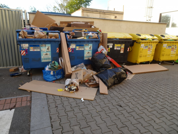 ulice Zverinova velky neporadek u kontejneru na srideny odpad.