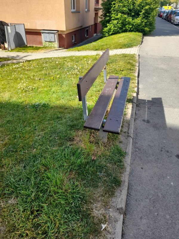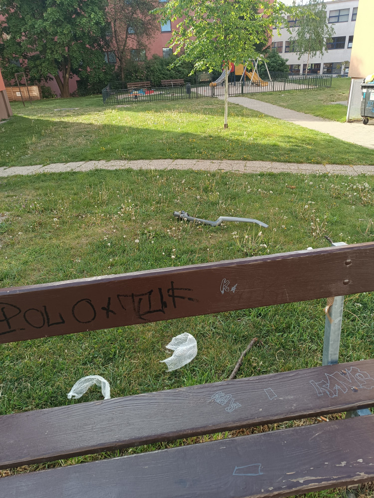 Nepořádek u lavičky u domu Na Vrcholu 8