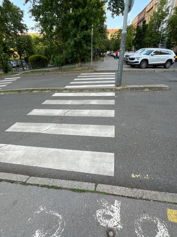 Prosím odstranit bariéry a přidat nájezdy na tomto přechodu - je to velmi nebezpečné pro chodce (obzvláště v noci) a nepřekonatelné pro vozíčky a kočárky. Není legální, aby přechodem pro chodce vedl 20cm vysoký betonový rantl.