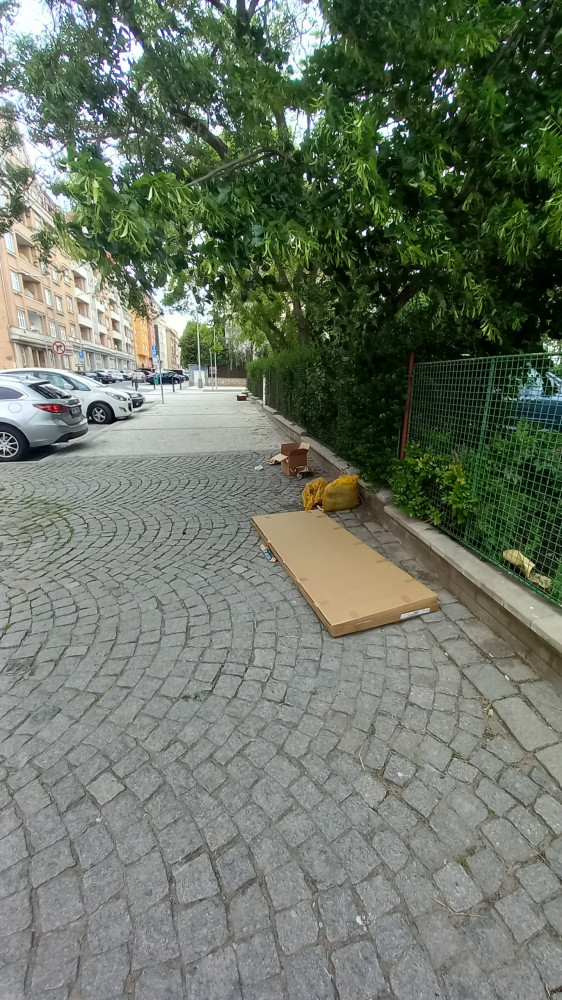 Jeseniova x Ambrožova-naproti separace několik krabic a pytlů na chodníku