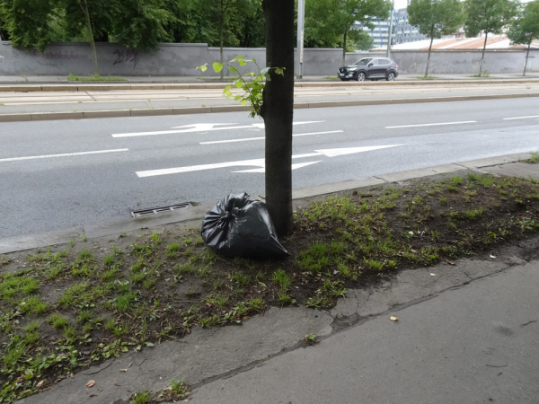 Na Ulici Jana Zelivskeho nedaleko zastavky tramvaje Mezi Hrbitovy je vyhozeny u stromu velky cerny pytel s odpadem. Prosim o uklid.