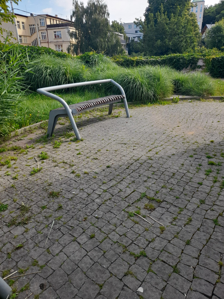 Nepořádek v parčíku u lavičky.. Krabice a skleněné nádobky. Vntroblok Lupáčova Prokopova Rokycanova.