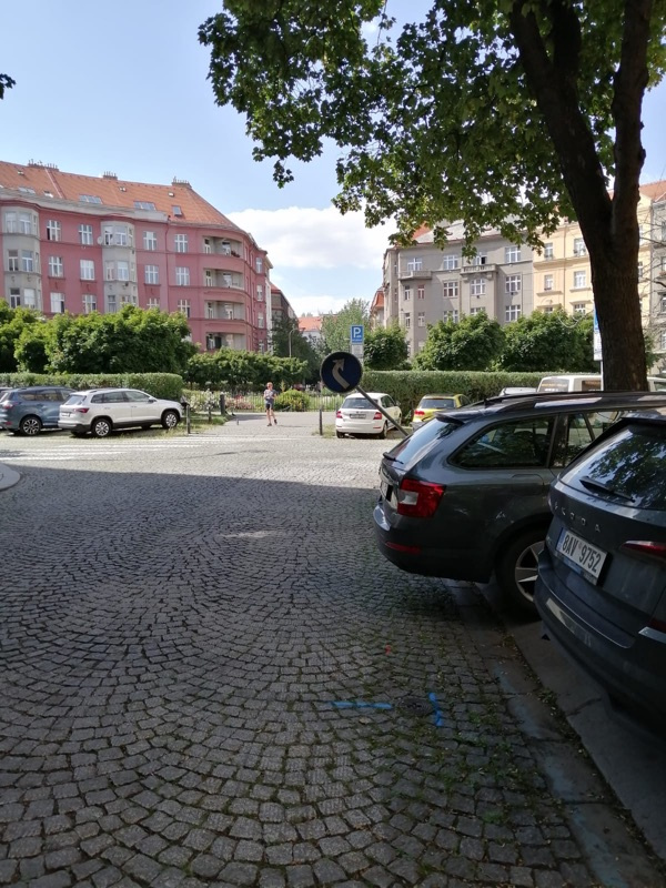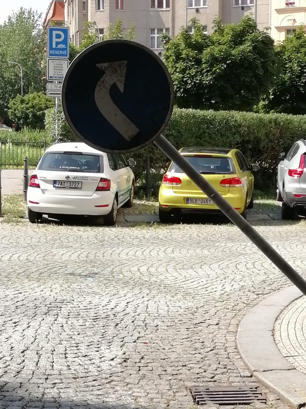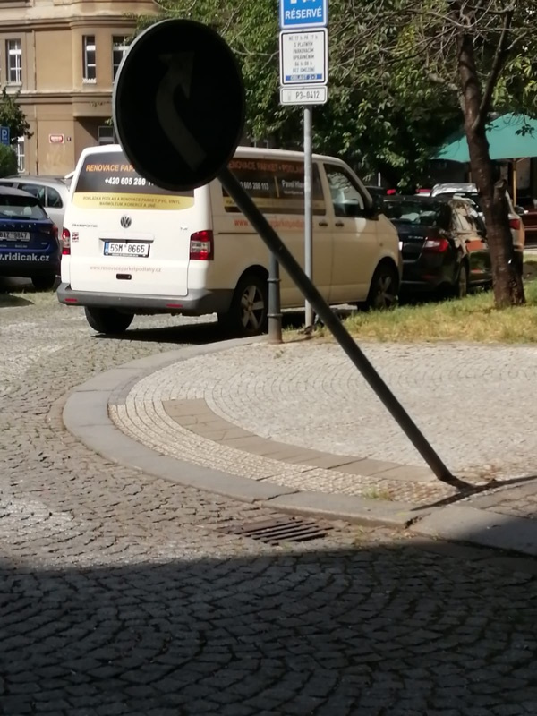 Dopravní značka se kácí do ulice a ohrožuje provoz