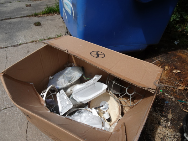 Dobry den v ulici Na Trebesine je vedle kontejenru na trideny odpad papirova krabice, ve ktere jsou vyhozeny stare elektorinstalace - svitidla, kryty na svitidla atd. Vyhodil to tam nejaky nepoctivy remeslnik.